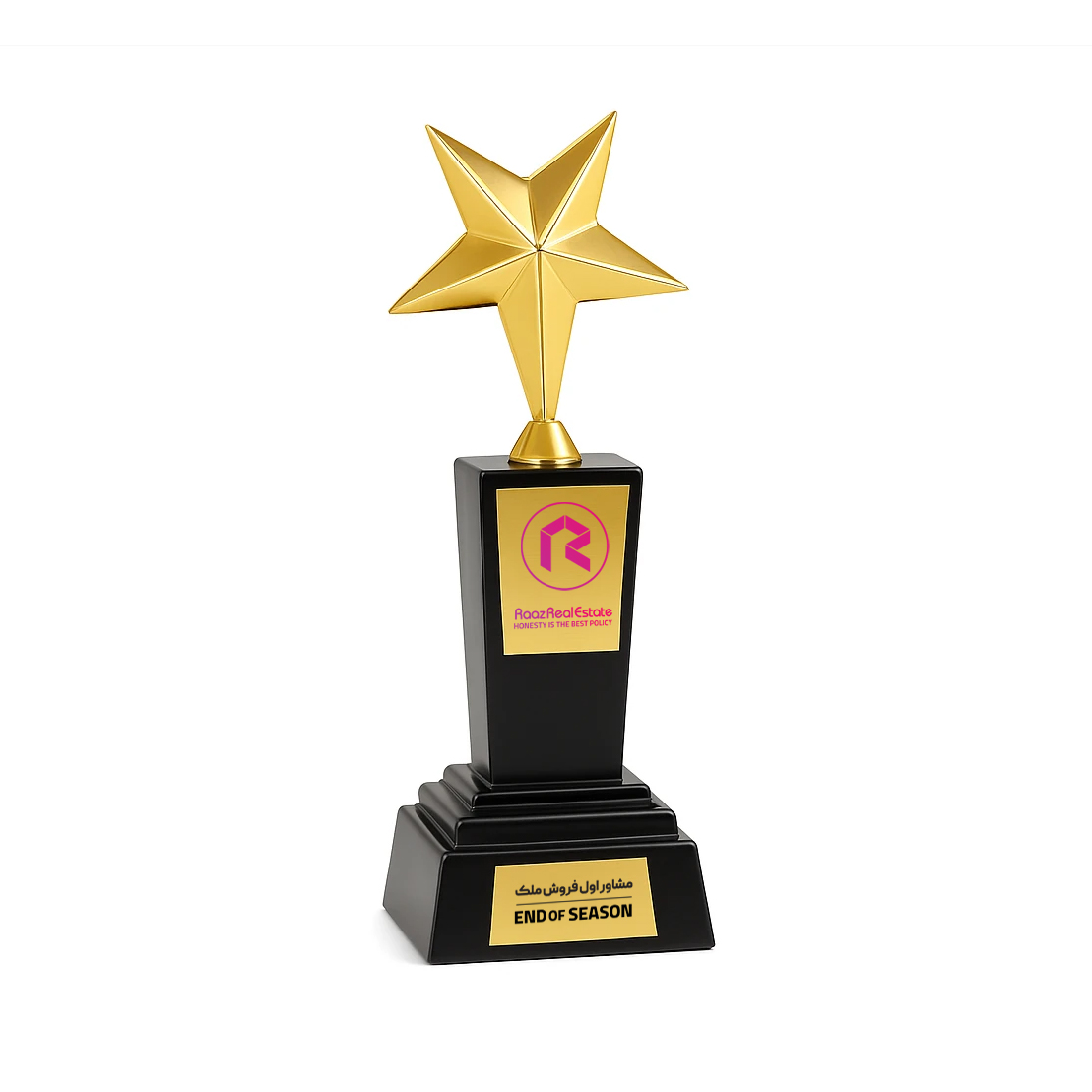 بخش اصلی تندیس شامل ستاره فلزی آبکاری طلایی است که با حجمپردازی زاویهدار و سطوح براق، جلوهای لوکس و چشمگیر ایجاد میکند. این ستاره روی پایه ای با تنه چوبی مشکی یا ماهگونی قرار گرفته که با فرم مخروطی-پلهای، حس استحکام و وقار بیشتری به اثر میدهد.