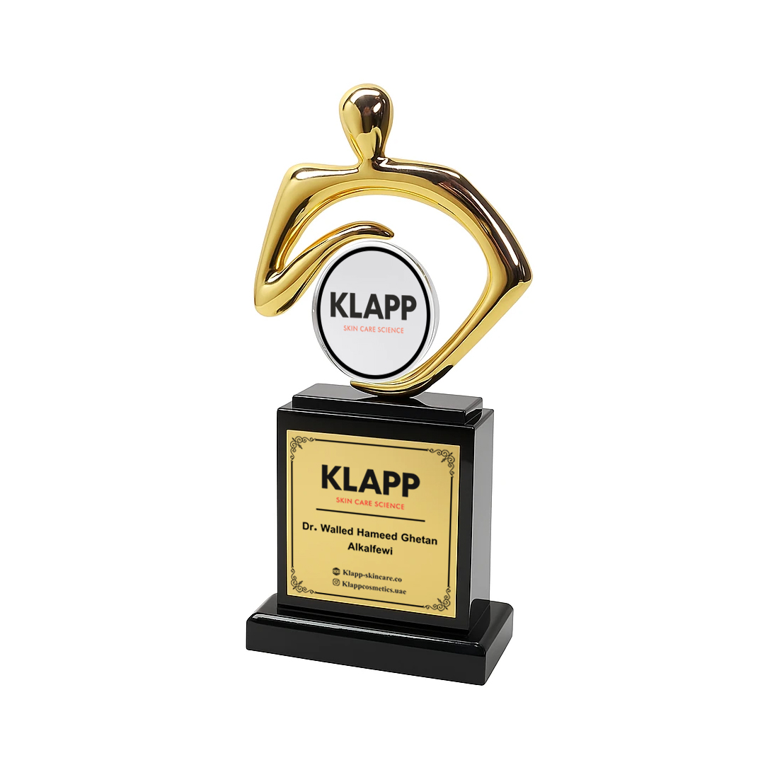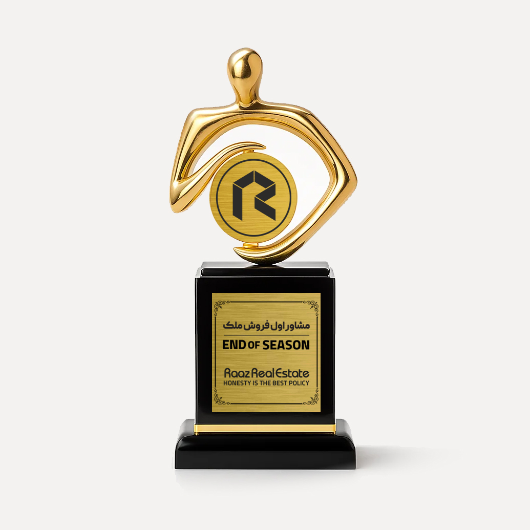 تندیس پیکره از بدنه مجسمهای فلزی با آبکاری طلایی براق ساخته شده است؛ فرمی سیال و انسانی که با یک حرکت منحنی، یک مدالیون دایرهای را در بر میگیرد. این مدالیون بهصورت آکریلیک یا فلزی تولید میشود و امکان چاپ لوگو یا نشان سازمانی را با کیفیت بسیار بالا فراهم میکند. پایه از آکریلیک مشکی دولایه ساخته شده که استحکام و ایستایی تندیس را تضمین کرده و تضاد رنگی زیبایی با بخش طلایی بالایی ایجاد میکند. روی قسمت جلویی پایه، قابلیت نصب پلاک اختصاصی در جنسهای طلایی، نقرهای یا مشکیمات وجود دارد؛ مناسب برای درج نام دریافتکننده، عنوان رویداد یا پیام قدردانی.