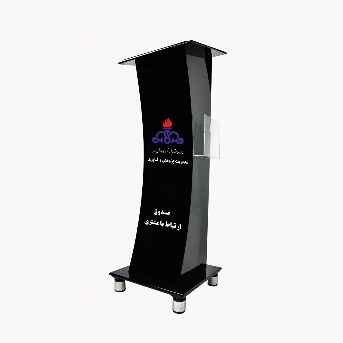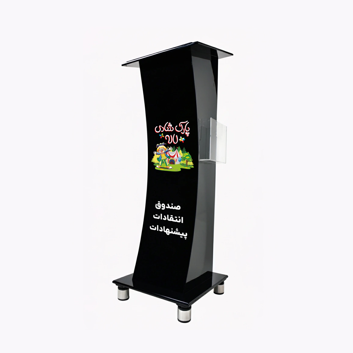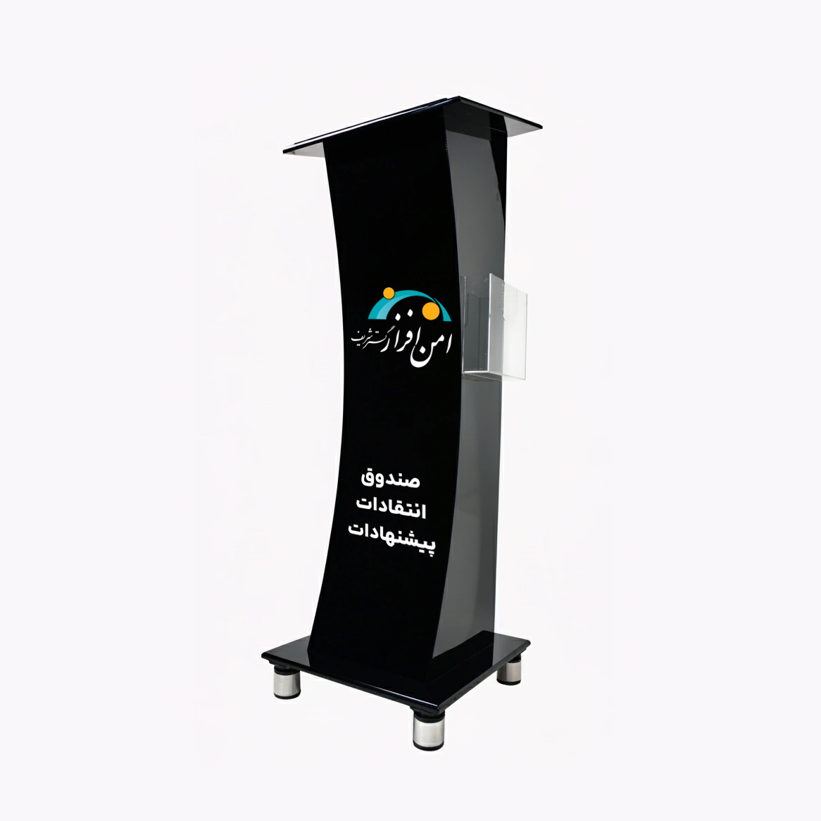صندوق پیشنهادات و انتقادات ایستاده پلکسی مشکی؛ طراحی رسمی و مدرن با چاپ اختصاصی