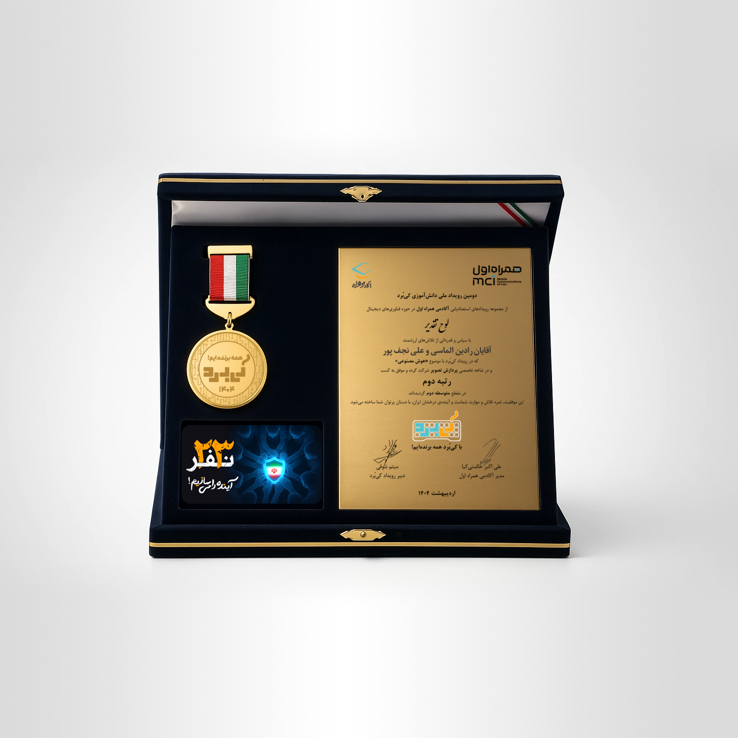 نشان افتخار آویدان در یک جعبه چوبی مقاوم با روکش جیر سرمهای طراحی شده که جلوهای لوکس، تشریفاتی و سازمانی به محصول میبخشد. فضای داخلی جعبه با چیدمان دقیق، شامل یک مدال فلزی با کیفیت بالا است که بهصورت استاندارد طراحی شده و قابلیت جداسازی و نصب روی سینه را دارد. بر روی مدال فلزی امکان چاپ اختصاصی نام، لوگوی رویداد یا مجموعه با ماندگاری بالا فراهم شده است. در کنار مدال، یک پلاک شبهفلزی طلاییرنگ قرار دارد که قابلیت چاپ متن تقدیر، عنوان مراسم، نام دریافتکننده و تاریخ رویداد را به صورت کاملاً سفارشی ارائه میدهد. همچنین فضای مشخصی برای قرارگیری کارت هدیه در نظر گرفته شده که ارزش معنوی و کاربردی این نشان را دوچندان میکند. نشان آویدان بهعنوان یک نشان افتخار آماده و نشان تقدیر فوری با امکان تحویل اکسپرس ۴۸ ساعته از طریق فروشگاه نوینتندیس قابل سفارش است.